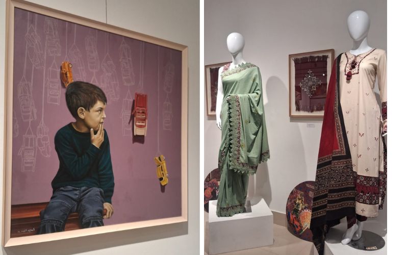 Bachelor of Fashion Design (BFD) students from NTU attended the exhibition to gain valuable academic exposure, observing professional standards in thesis presentation, conceptual development, and artistic execution. The visit was conducted under the guidance of Miss Hina Zehra, Miss Aliza Shah, and Miss Tayaba Syed, esteemed faculty members of the Fashion Design Program, who provided mentorship and facilitated discussions on integrating interdisciplinary art insights into fashion design.
