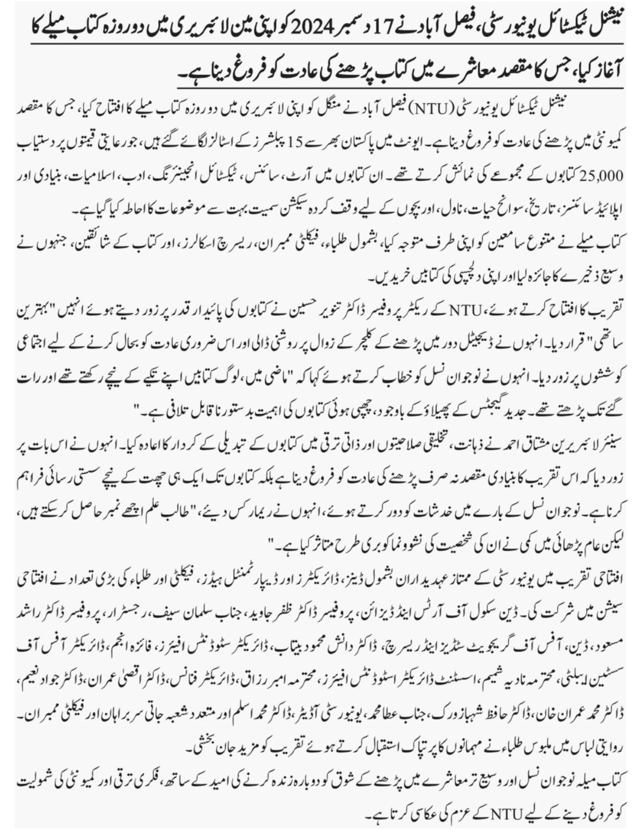 The National Textile University (NTU) Faisalabad inaugurated a two-day book fair at its Library on Tuesday, aiming to encourage the habit of reading within the community. The event featured stalls from 15 publishers from across Pakistan, showcasing a collection of 25,000 books available at discounted prices. The books covered a wide range of topics, including art, science, textile engineering, literature, Islamic studies, basic and applied sciences, history, biographies, novels, and a dedicated kids’ section.