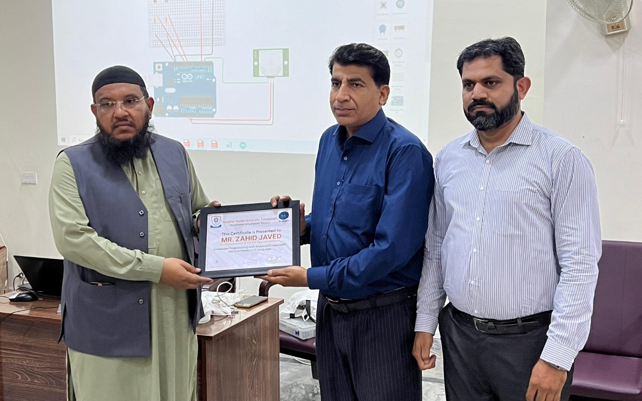 Society of Software Engineers (DCS) organized a One Day Workshop on Embedded Programming with Arduino/ATmega328P Microcontrollers in C-language on Wednesday May 15, 2024, in Multipurpose Hall, New Academic Block. Mr. Zahid Javed (Lecture DCS) lead the workshop. The focus of the workshop is to understand the characteristics of Embedded Systems, Overview of Arduino platform and its components, Introduction to ATmega328P microcontroller, Uno board and its peripherals, configuring digital pins as input or output, Reading and writing digital values, Configuring PWM for analog output, Serial Communications and Sensors Classification.