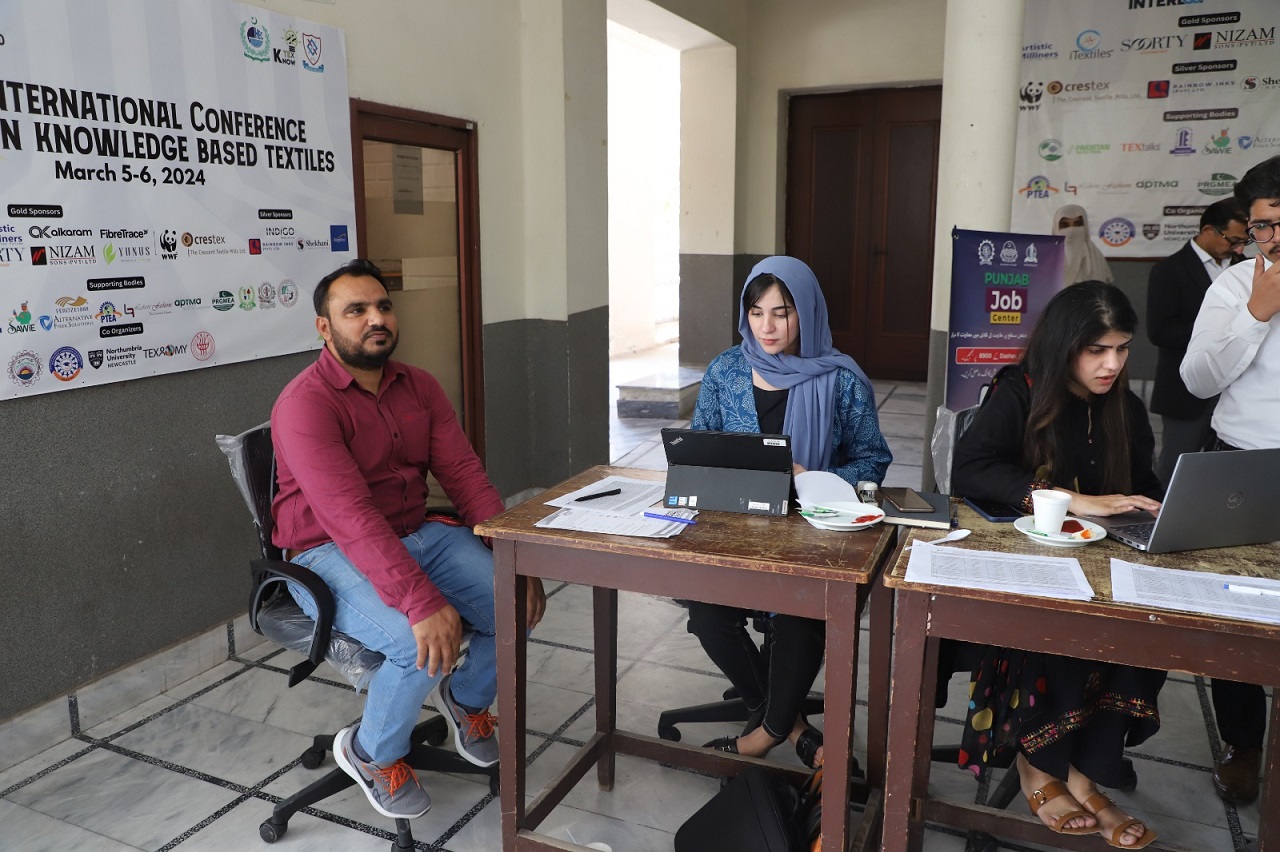 GIZ is supporting the textile industry in Pakistan's economic development and employment. In this regard, a recruitment drive for NTU students was organized by GIZ in association with the NTU Placement Cell and YDC. The effort was supported by the Faisalabad textile and fashion industry, which included Kay & Emms Private Limited, Klash Pvt., Beacon Impex (Pvt) Ltd., Maheen Textiles, and Ambition Clothing. Final-year students from each school at NTU were interviewed by HR professionals from the sector. The Punjab Job Portal and Shemeanswork-SMW both displayed the digital job registration process for the students.