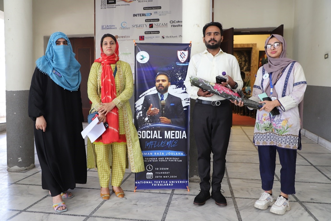 WINGS Society of National Textile University (NTU) Faisalabad hosted an insightful seminar on the "Influence of Social Media," featuring Usman Raza Joulaha, Founder and President of Volunteer Force Pakistan. The event, held on May 30, 2024, focused on the power and impact of social media in contemporary society. Usman Raza Joulaha shared strategies for leveraging social platforms for positive change, emphasizing responsible use and community mobilization. This seminar highlighted NTU's commitment to equipping students with the knowledge to navigate and utilize digital tools effectively.
