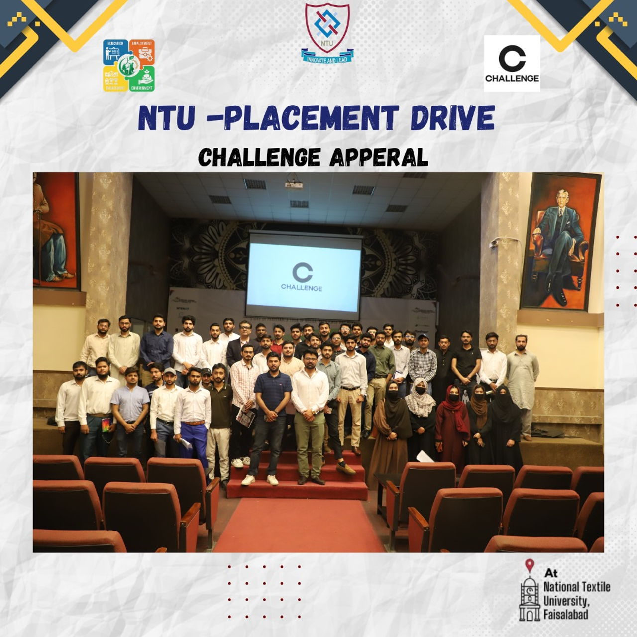 On April 16, 2025, National Textile University’s PM-YDC organised a placement drive for Challenge Apparel Limited. Dr. Imran Khan, Deputy Director of Job Placement and Internships, coordinated the event with the support of NTU-PMYDC and the Advisor’s Office. The drive drew a large number of students eager to pursue career opportunities in the textile sector.