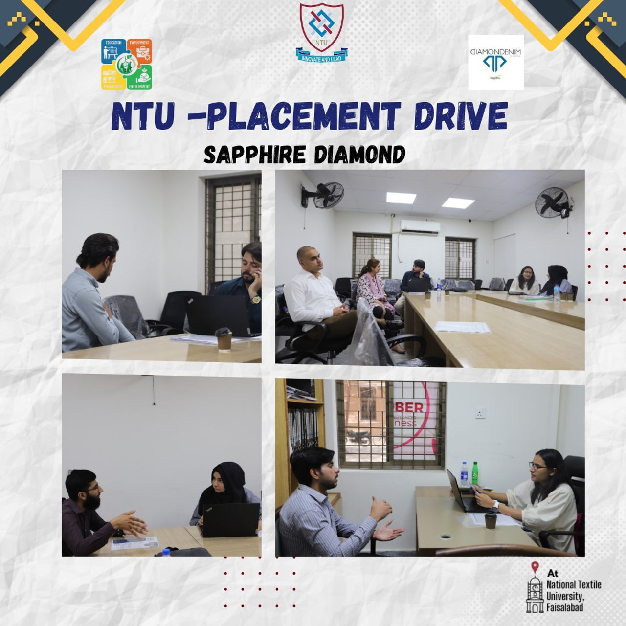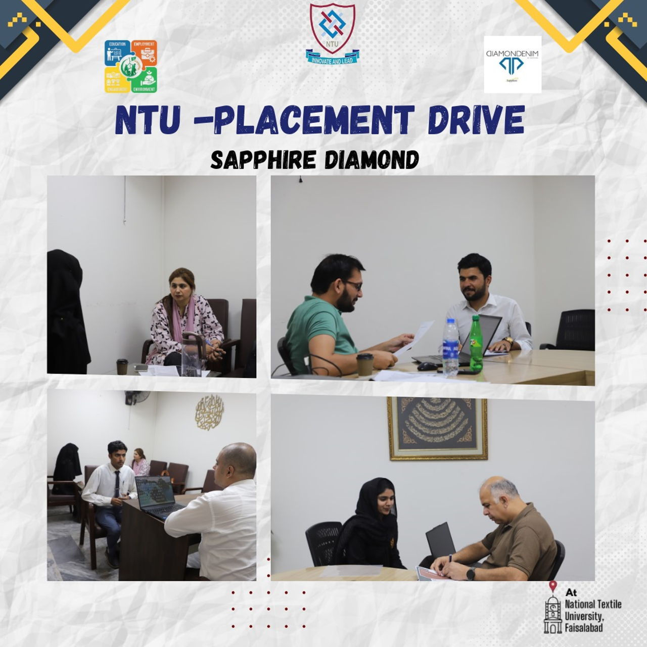 National Textile University (NTU) hosted a placement drive at the PMYDC Centre, welcoming the HR Director of Sapphire Diamond Fabrics Pvt Ltd, Syed Faraz Shahid, along with his team on April 22, 2025. The event was coordinated by Dr. Imran Khan, Deputy Director of Job Placement and Internships, with support from NTU-PMYDC and the Advisor’s Office. Aimed at providing students with valuable career opportunities in the textile sector, the drive attracted a significant number of aspiring graduates. The following are the details of this placement drive: