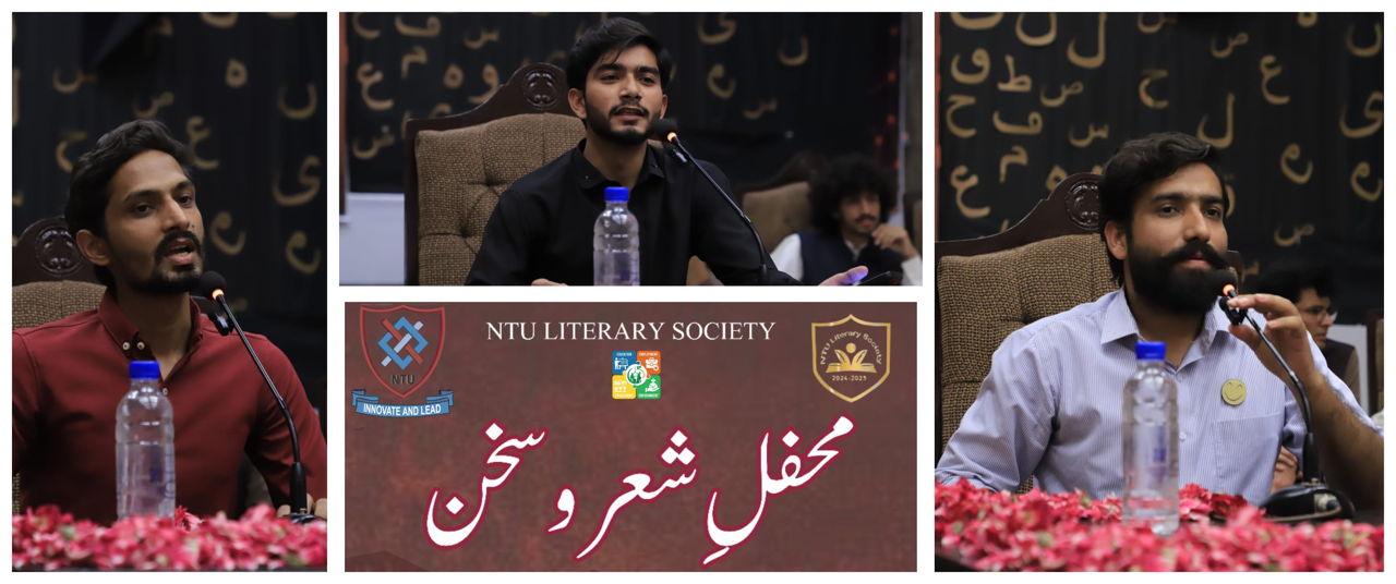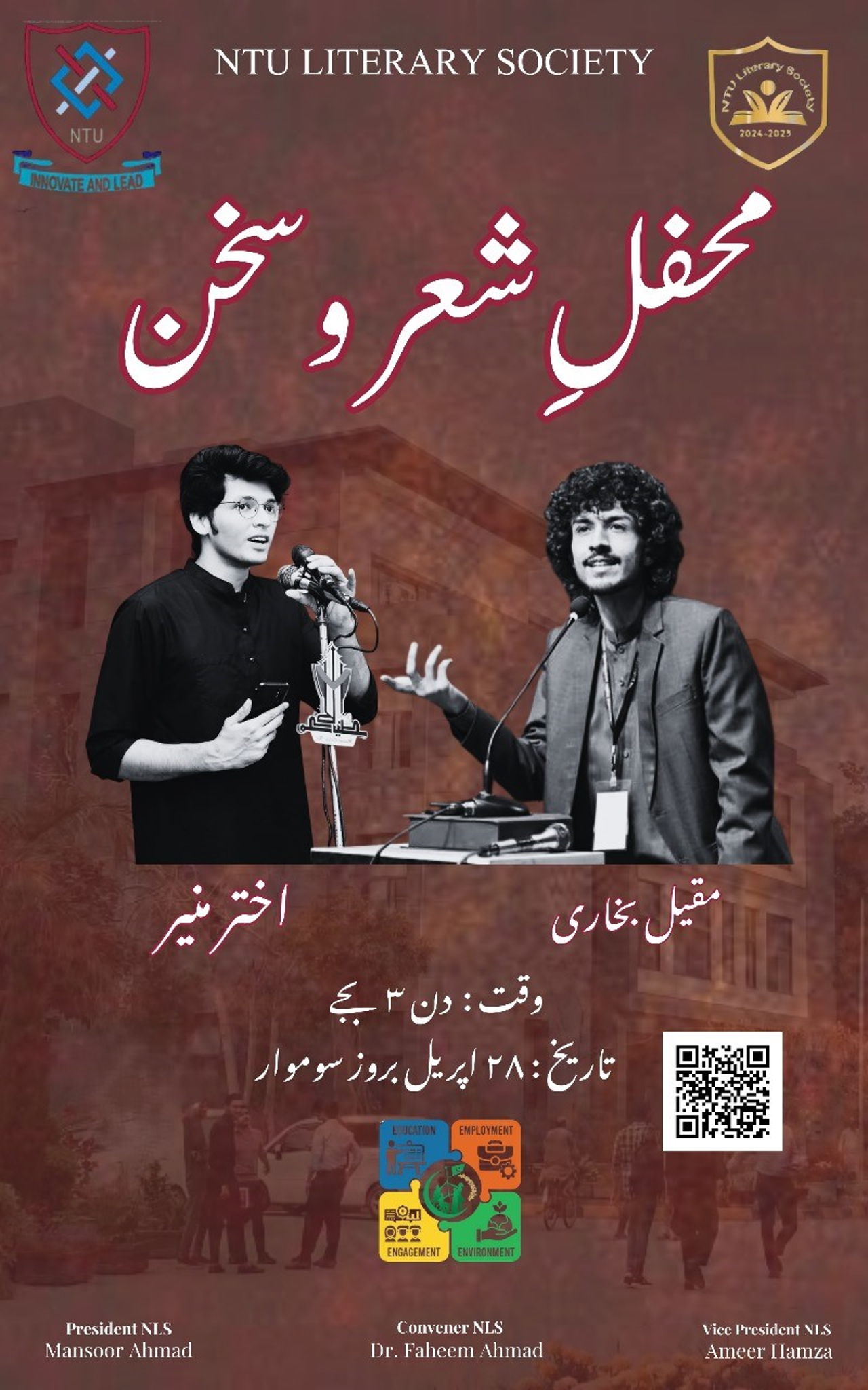 The NTU-PMYDC Literary Society hosted a soulful and memorable event, "Mahfil-e-Sher-o-Sukhan," on 28th April 2025, celebrating poetry, culture, and creativity. Featuring renowned poets Akhtar Munir and Muqeel Bokhari, the evening captivated audiences with powerful ghazals and nazams.