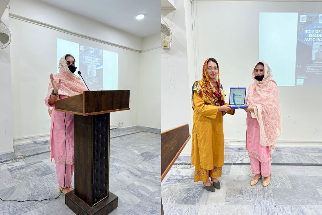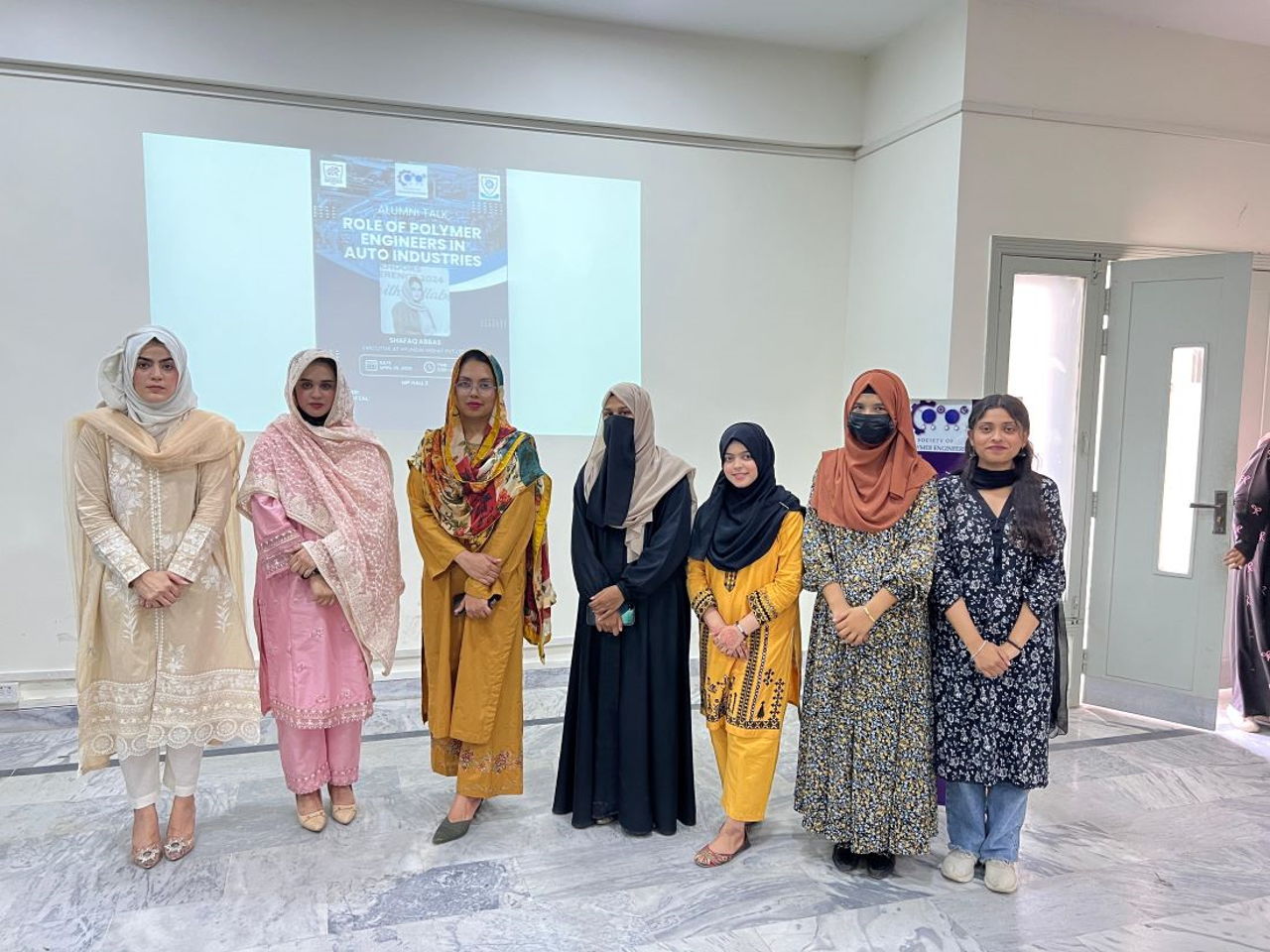 Society of Polymer Engineers successfully organized an engaging Alumni talk on the topic "Role of Polymer Engineers in Auto Industries" on 29th April, 2025. The event featured a distinguished alumnus, Shafaq Abbas (Executive at Hyundai Nishat Pvt LTD) who shared valuable insights into the evolving contributions of polymer engineers in the automotive sector, particularly in lightweight materials, fuel efficiency, and sustainable design. Students gained real-world knowledge about industrial applications, current trends, and career opportunities. The session concluded with an interactive Q&A, leaving attendees inspired and better informed about their future roles in the industry.