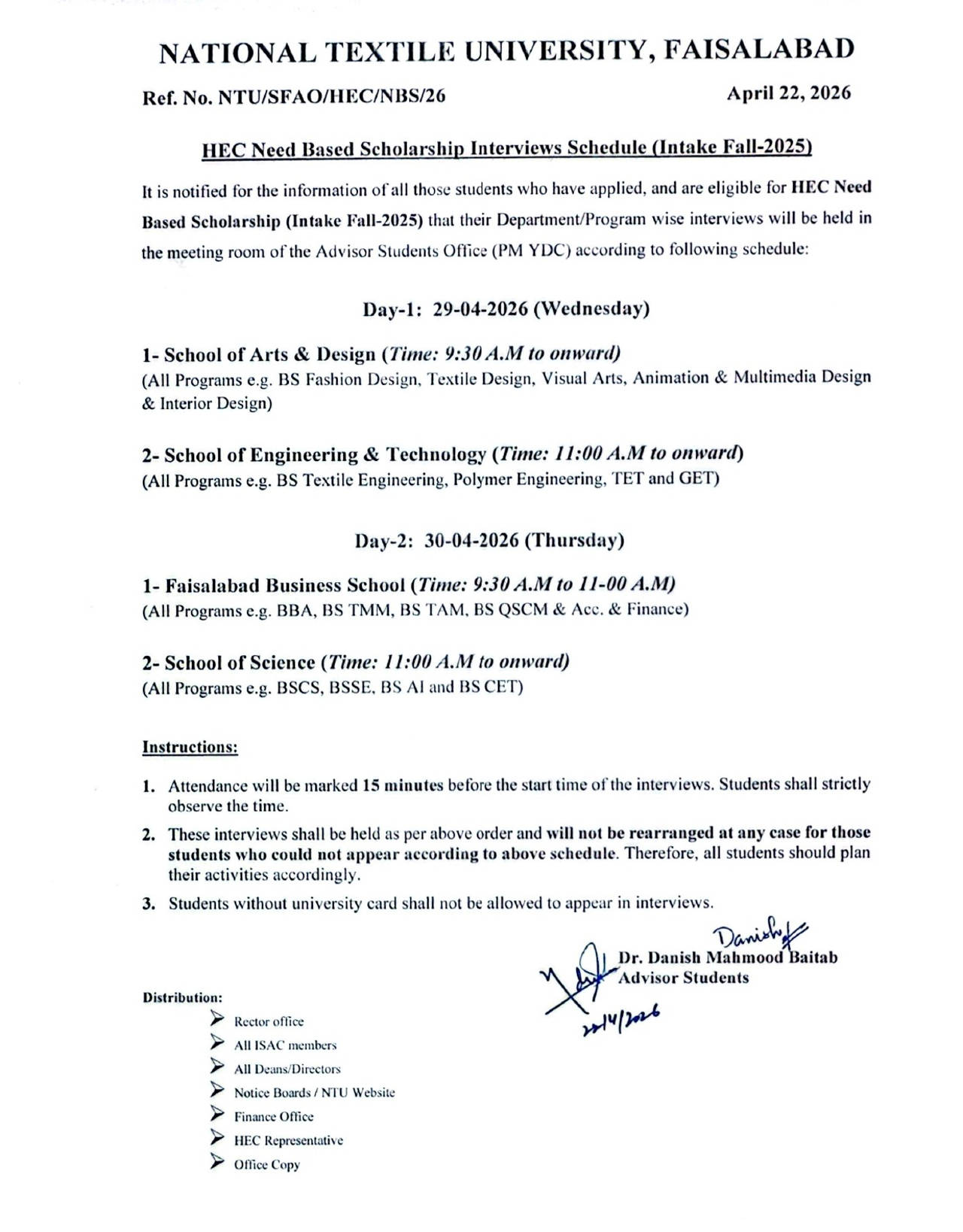 HEC Need Based Scholarship Interviews Schedule (Intake Fall-2025)