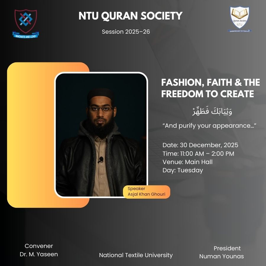 The NTU-PMYDC Quran Society organized an inspiring session titled “Fashion, Faith & The Freedom to Create” on Tuesday, 30th December 2025, guided by Convener Dr. Muhammad Yaseen. The event featured Asjal Khan Ghouri as the guest speaker who is renowned young Qur’an Teacher. He delivered a thought-provoking talk on balancing creativity with Islamic values, emphasizing that faith gives creativity purpose, dignity, and direction. Students were encouraged to express themselves confidently while upholding modesty and strong moral principles. The session left participants inspired to integrate faith into their creative journeys.