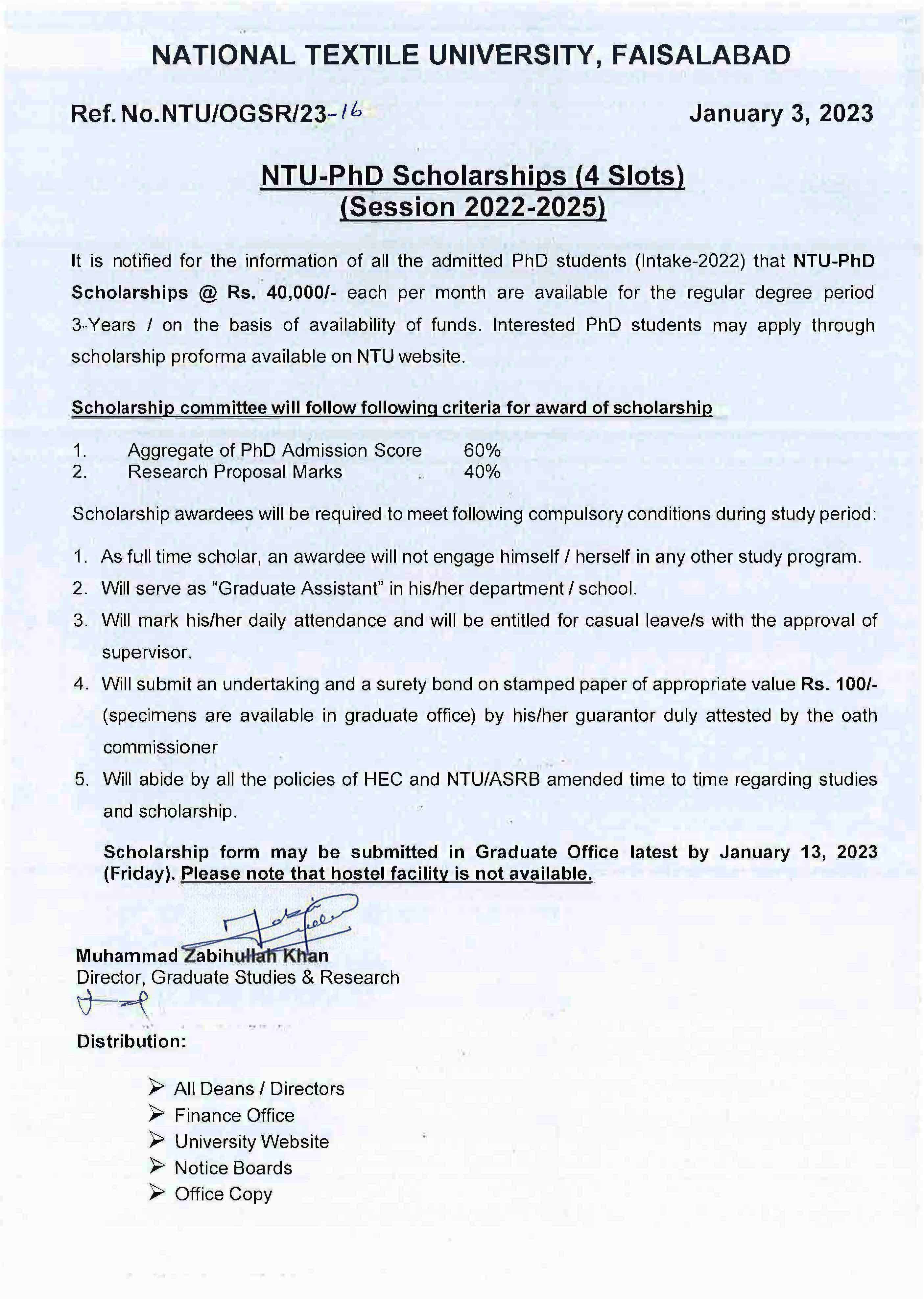 NTU-PhD Scholarships (4 Slots ) Session 2022-2025