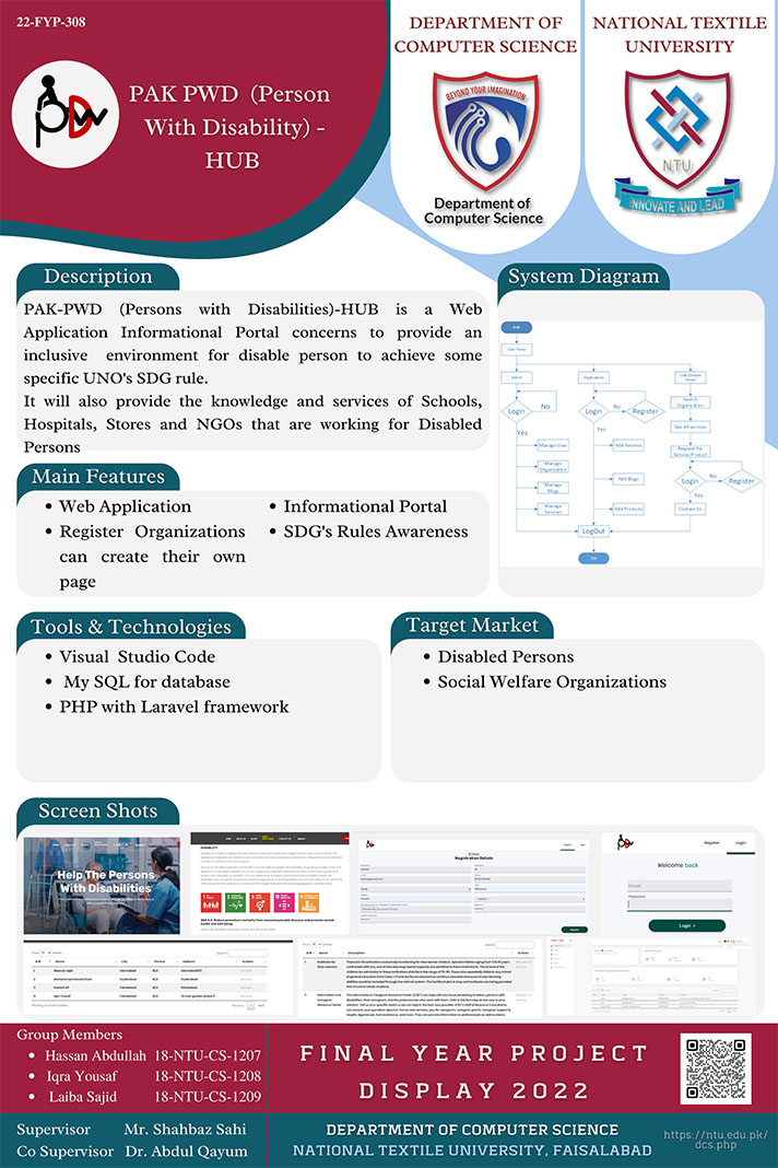 PAK-PWD (Persons with Disabilities)-HUB is a Web Application Informational Portal concerns to provide an inclusive environment for disable person to achieve some specific UNO's SDG rule.It will also provide the knowledge and services of Schools,Hospitals, Stores and NGOs that are working for Disabled Persons.