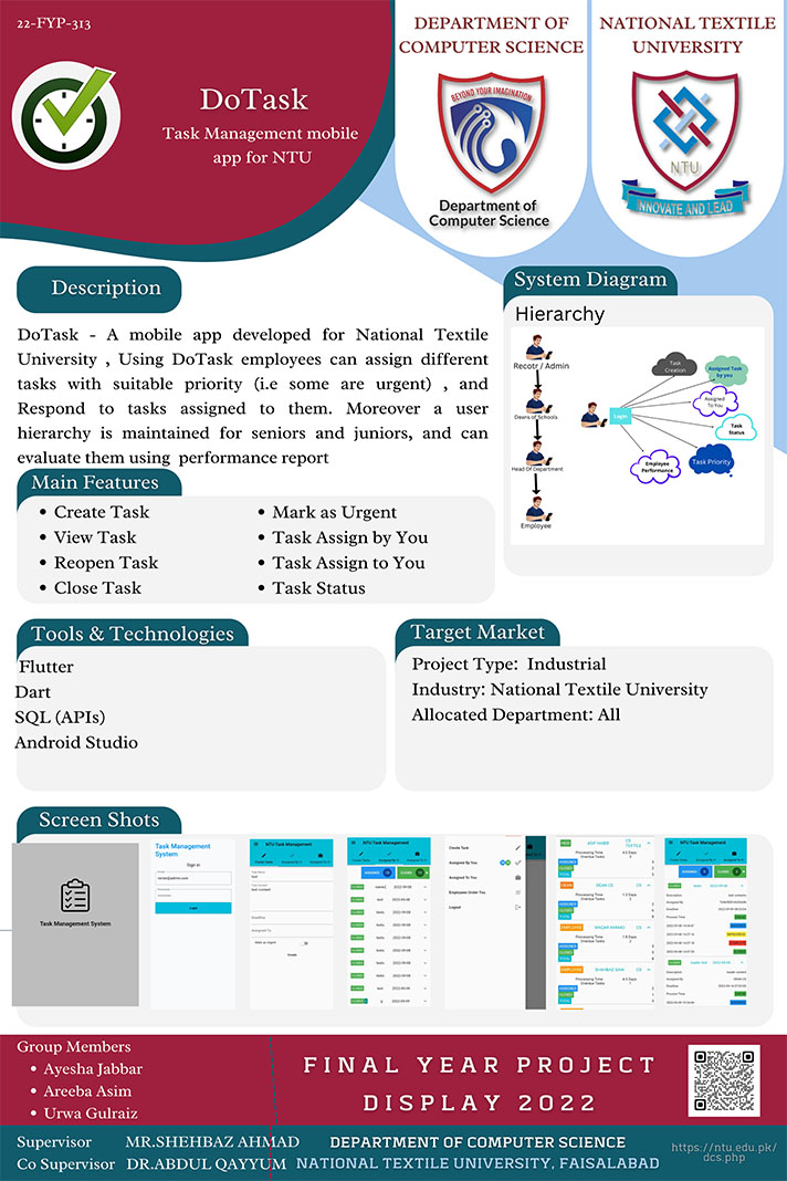 DoTask - A mobile app developed for National Textile University , Using DoTask employees can assign different tasks with suitable priority (i.e some are urgent) , and Respond to tasks assigned to them. Moreover a user hierarchy is maintained for seniors and juniors, and can evaluate them using performance report.