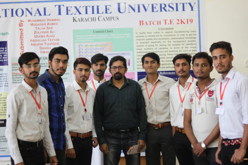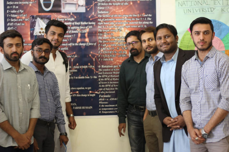 The National Textile University Karachi Campus organized the poster presentation competition on "The Application of Mathematics in Science & Engineering". The poster presentation competition was held on 6th December, 2019. All the students were participated under the supervision of Dr. Danish Hassan (Department of Applied Sciences). Dr. Muhammad Qamar Khan (HoD, Department of Textile Engineering), Engr. Arshad Faruqui (HoD, Department of Polymer Engineering) and Dr. Syed Majid (Assistant professor of Department of Polymer Engineering) were the jury board members for poster competition. The winner of poster presentation competition is as under.
