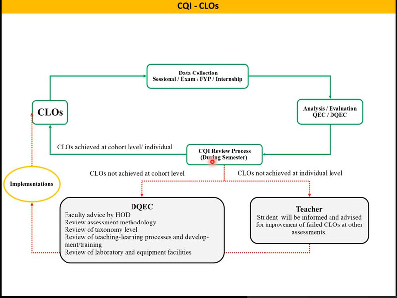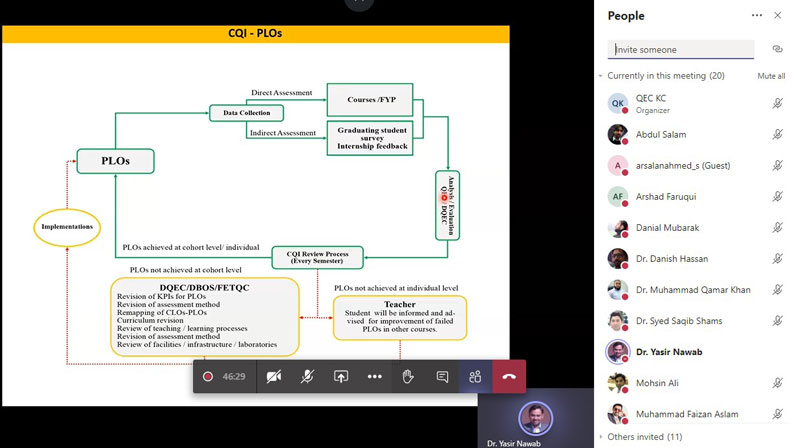 Quality Enhancement Cell of National Textile University (NTU), Karachi Campus organized an online training session on “CQI and Complex Engineering Activity in OBE System” through MS Teams. Dr. Yasir Nawab, Associate Professor/Dean FET, National Textile University, Faisalabad was the Resource Person. The session covered CQI with reference to CLOs, PLOs and PEOs, apprehension of Complex Engineering Problems and Open Ended Labs with practical examples.