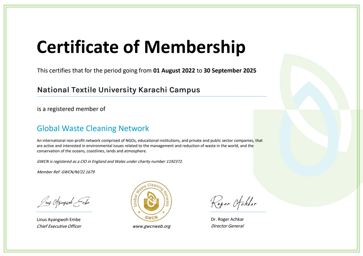 NTU – Karachi Campus got Three Years membership of Global Waste Cleaning Network (GWCN)