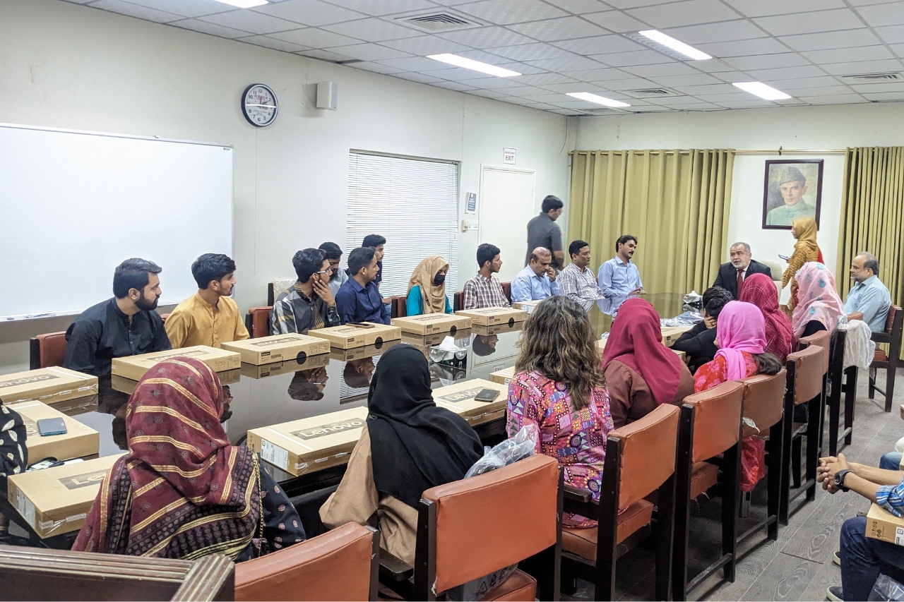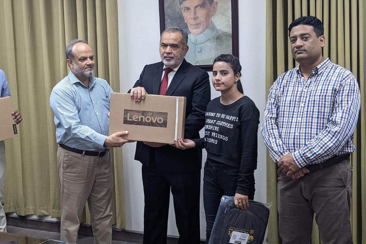 Mr. Muhammad Jawed Bilwani, Chief Coordinator PHMA, Vice Chairman BMG Group, KCCI, BOG member of NTU graced the occasion and presented laptops to a total of twenty-three students of NTU-Karachi Campus. Mr. Jawed Bilwani addressed the students and congratulated them on getting laptops and highlighted the privilege students have in getting textile education from National Textile University. He further emphasized working hard and acquiring the best skills during their studies.