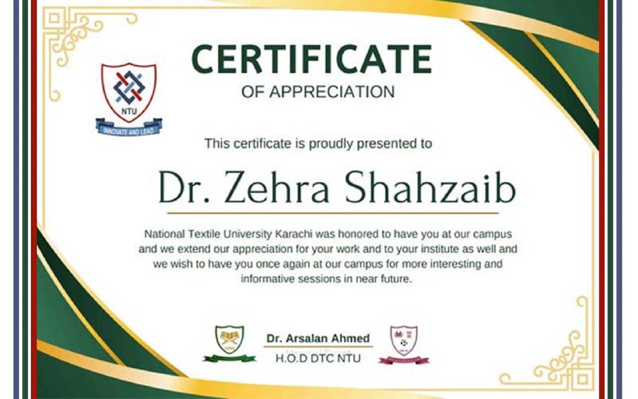 At the end of the session, the National Textile University-Karachi Campus awarded a certificate to Dr. Zehra as a token of appreciation for her time and efforts in sharing with students the Islamic and cultural values focusing females, especially students.