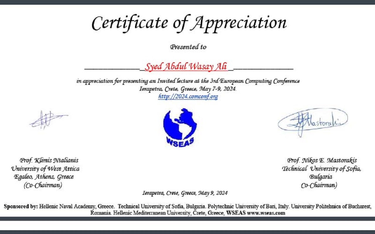 On May 8th, 2024, National Textile University Karachi participated in the 3rd European Computing Conference held in Athens, Greece, under the organization of Prof. Nikos E Mastorakis. This conference gathered computing professionals and academics from around the world. Notably, a team from National Textile University presented pioneering research on the application of artificial intelligence (AI) in analyzing the spread of COVID-19.