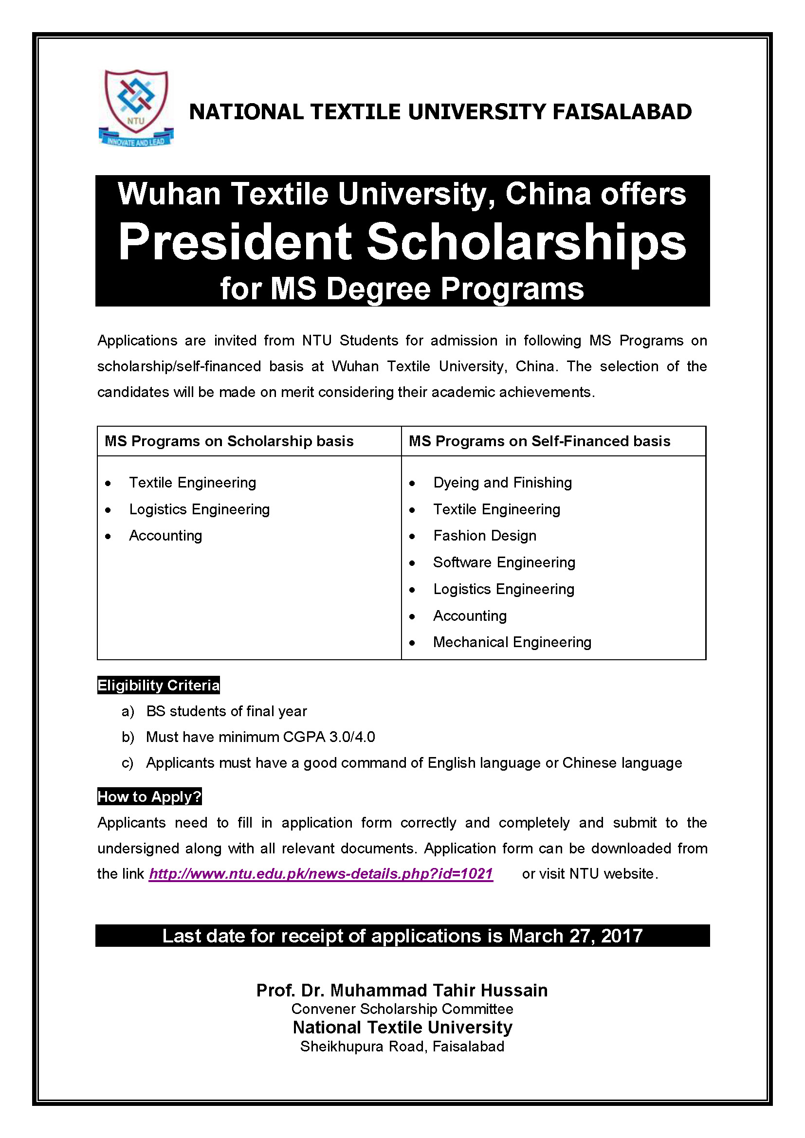 Wuhan Textile University (WTU), Wuhan China offers Presidents Scholarships for NTU students for various MS degree Programs. Last date to apply is March 20, 2017. Detail is given in the following advertisement.
