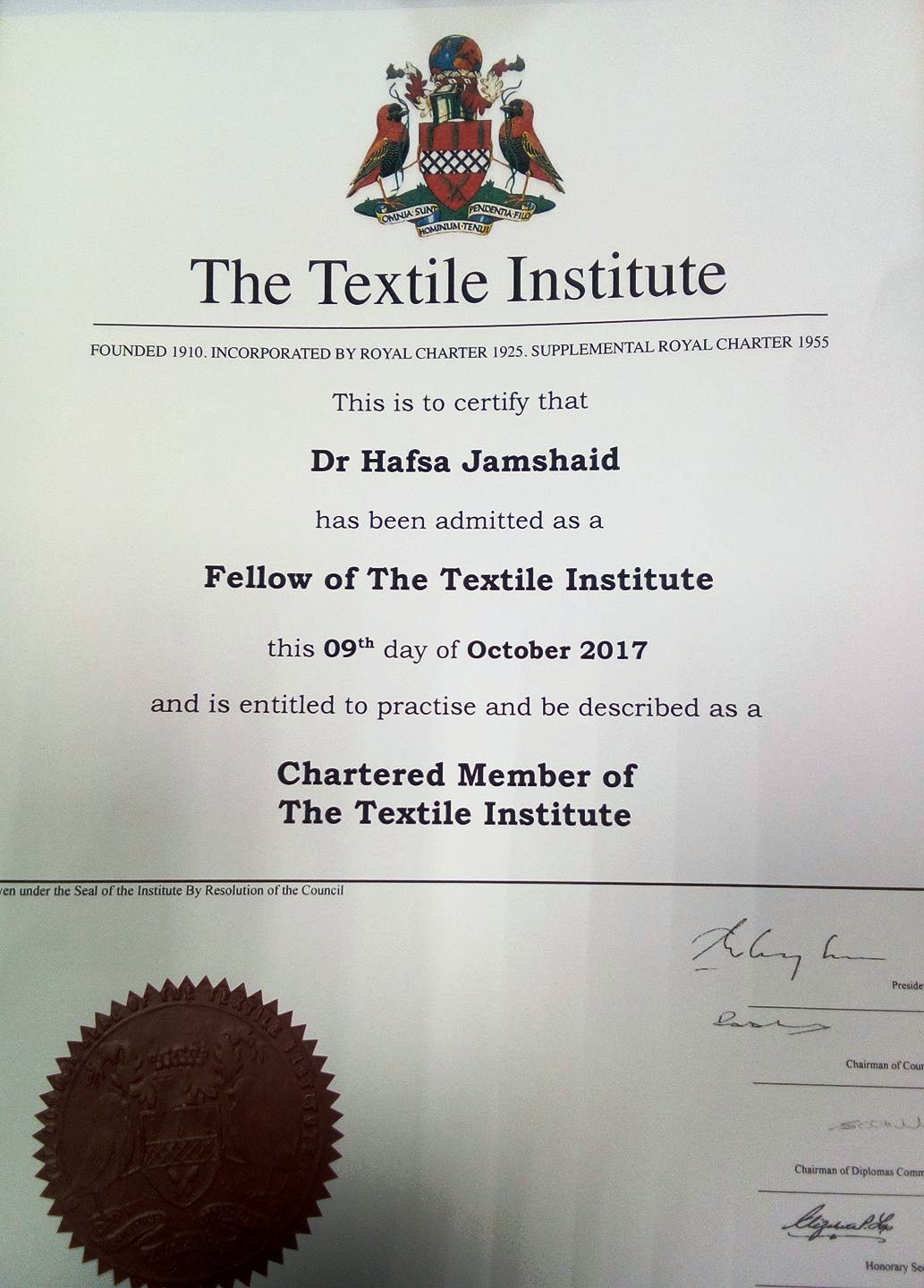 Dr. Hafsa Jamshaid, Chairperson Knitting, has been awarded Fellowship of Textile Institute, UK. The Fellowship is the chartered professional which is awarded under the Textile Institute's Royal Charter.