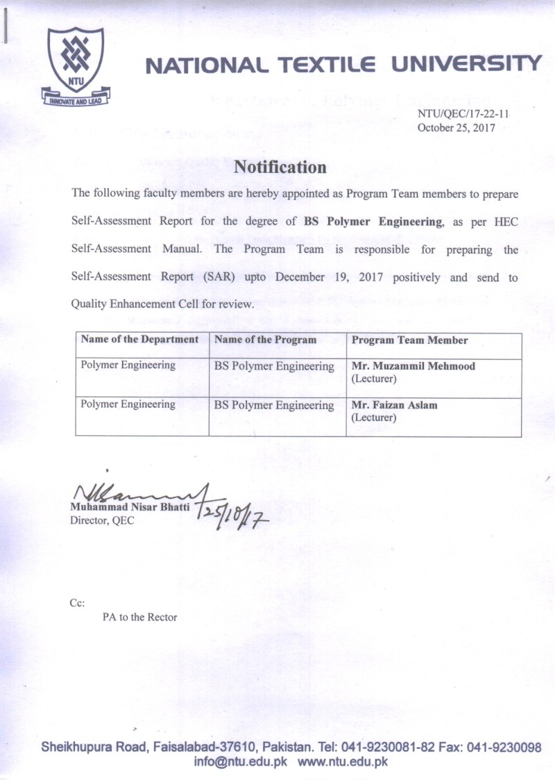 Notification of Program Team Members for the degree of BS Polymer Engineering