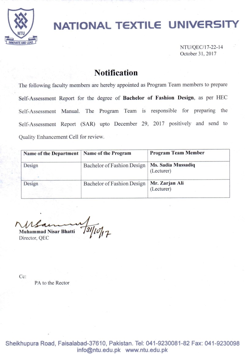 Notification of Program Team Members for the degree of Bachelor of Fashion Design