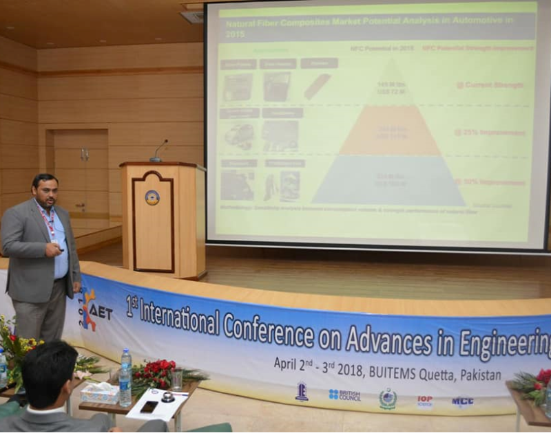 Dr. Yasir Nawab, gave a Keynote talk on “Mechanical Characterization of Economical, Waste Based Hybrid Composites for Automotive Applications” in 1st International Conference on Advances in Engineering and Technology (ICAET) held on April 2nd - 3rd at BUITEMS, Quetta. He was invited by the host university and chaired a session on “Textiles”.