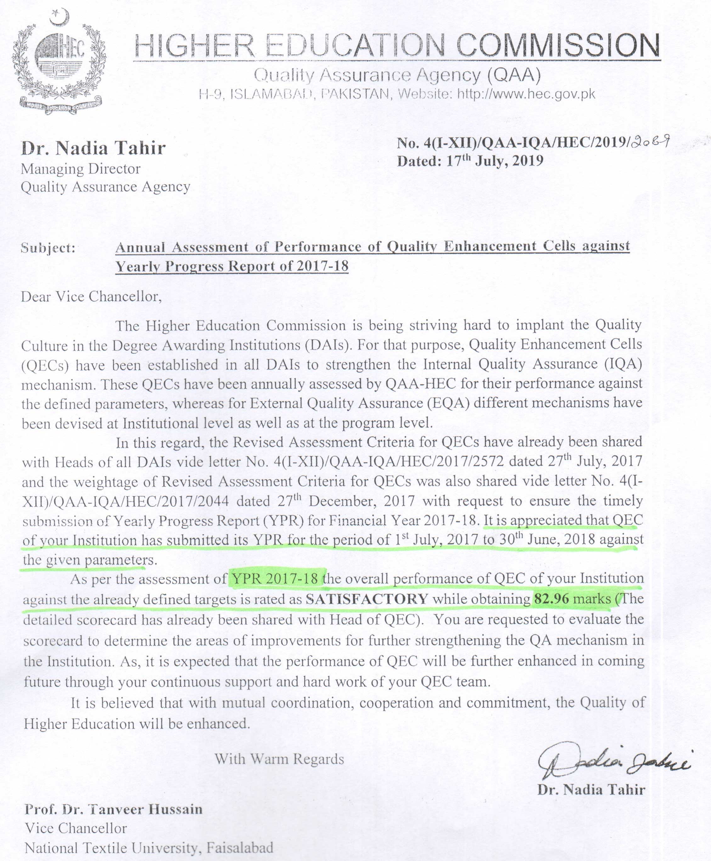 Quality Enhancement Cell obtained 82.96 marks in Yearly Progress Report of 2017-18