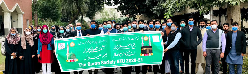 As per the directives of Chief Minister of Punjab, National Textile University continued the celebrations of Shane-e-Mustafa (PBUH). In this regard NTU Quran Society organized a walk on the campus on November 20, 2020. Faculty, staff members and students expressed their immense love and deep affection for beloved Holy Prophet Muhammad (PBUH) and renewed their pledge to truly follow ‘Seerat-un-Nabi (PBUH)’. The rally was leading by Dr Muhammad Yaseen convener Quran Society, Dr Sajjad Baig Director FMS and Dr Zafar Javed Director FH&SS, it culminated with Drood-o-Salam.