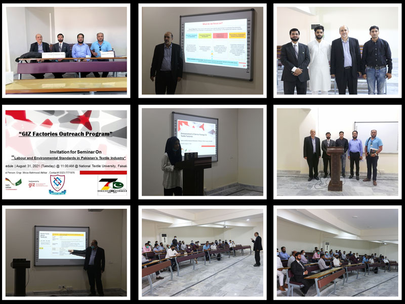 GIZ conducted a seminar on "GIZ Factories Outreach Program" in collaboration with SET NTU on 31, August 2021 (Tuesday) at School of Engineering & Technology NTU Faisalabad. Mr. Raza Abbas (Technical Advisor from GIZ) addressed the Labor and Environmental Standards in Pakistan's Textile Industry. Representatives of different Textile Industries attended the session. Mr. Mirza Mahmood Akhtar (Dy. Director Job placement/Lecturer Textile Engineering Department NTU) assisted as well as hosted the GIZ & Industry representatives.