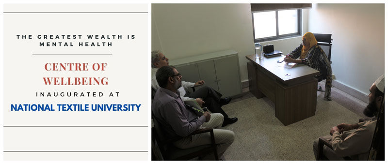 The establishment of “Centre for Wellbeing” in the National Textile University premises according to the directives of HEC is a new initiative taken by NTU. Worthy Rector Dr Tanveer Hussain inaugurated the facility. The inauguration was attended by Director Finance Zulfikar Ahmad, Advisor Students Dr Danish Mahmood, other staff members and students.