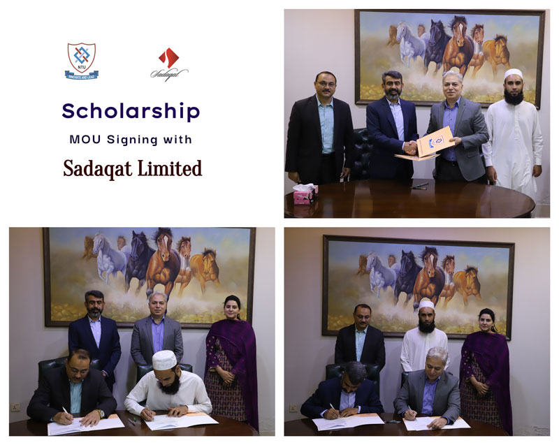 An MoU was signed for the launch of the Sadaqat Limited Scholarship on Monday, October 25, 2021. Mr. Muhammad Iqbal Ghori (Director Finance & Strategy) and Mr. Hummayun Shahzad Chief Financial Officer (CFO) from Sadaqat Limited were the representative from Sadaqat Limited Scholarship. Worthy Rector Dr Tanveer Hussain and Advisor Students Dr. Danish Mahmood Baitab from NTU signed the MoU. Ms Nadia Shamim Assistant Director of Students Affairs was the focal person of the Sadaqat Limited Scholarship program.