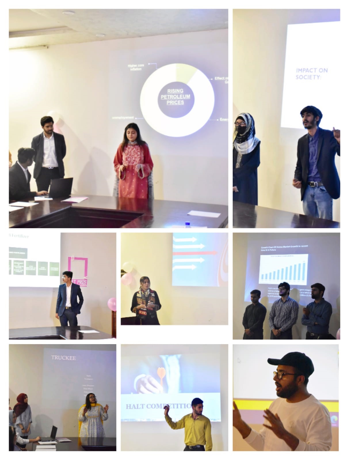Teams from All over the university pitch their business ideas and compete against one another. Respected judges of the competition were Mr. Faiq Zafa (CEO Dos Developers), Mrs. Saadia Sohail (CEO Glow green body care) and Miss Auj zehra (Co-CEO Fortified bakery).