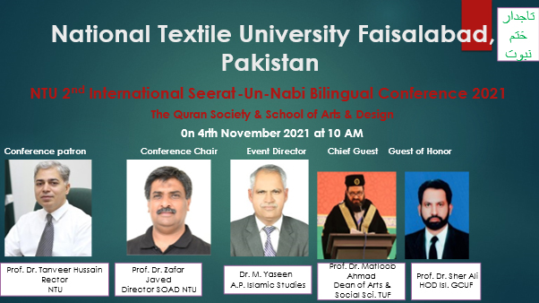 On 4th of November 2021, NTU Quran Society arranged 2nd International SEERAT UN NABI Bilingual conference’21 with the collaboration of school of arts & design. Prof Dr. Tanveer Hussain was conference patron, Dr. Zafar Javed, Dean school of arts & design was conference chair, Dr. M. Yaseen was event director of this conference. Prof Dr. Matloob Ahmad from The University of Faisalabad was the chief guest & Dr. Sher Ali from GCUF was guest of honor of this conference.