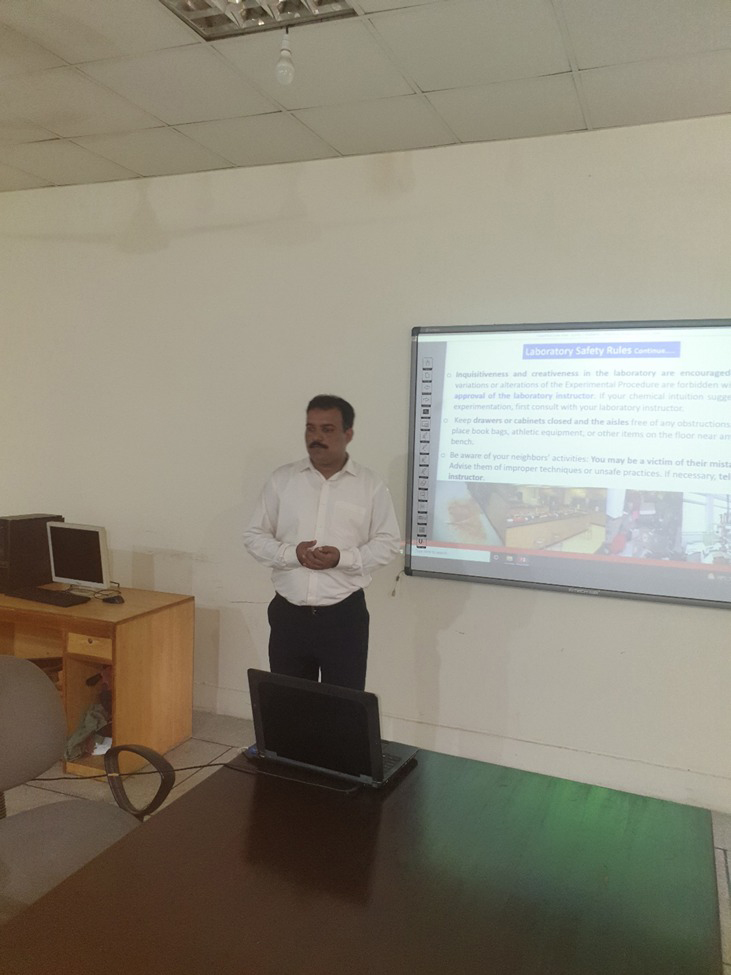 Department of Applied Sciences arranged a training on “Laboratory Safety and health assurance” on 06 Sep, 2022 (Tuesday) at 10 am in the meeting room of the department of Applied Sciences. All the faculty, staff members and postgraduate students of the department has attended the said training. Dr. Muhammad Asif Javaid was the invited speaker of the training.