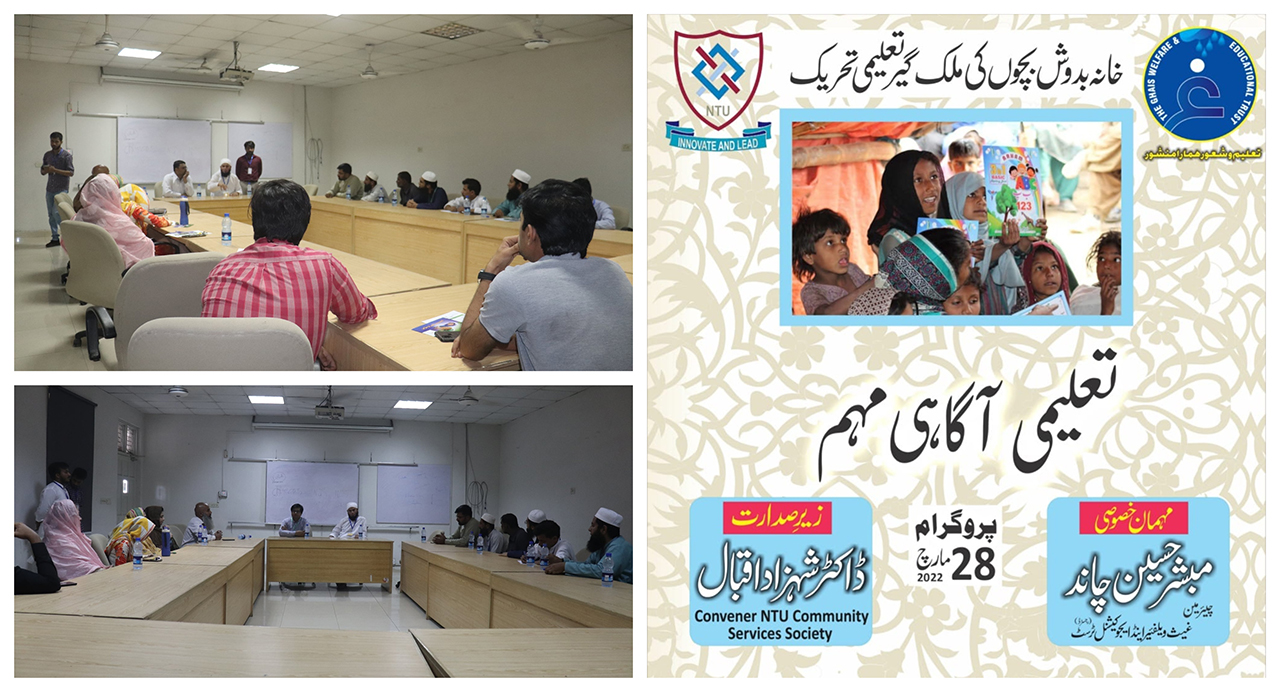 An awareness session regarding education in Jhughi's was conducted in NTU in collaboration with Ghais Foundaion by Community Service Society NTU and Visual Arts. Ghais foundation is the largest NGO in Pakistan providing fee education at the door step to the children of deprived portion of society. Chairman Ghais Foundation Mubashir Husain Chand interacted with faculty and students to spread the awareness of the project. He urged everyone to participate in this project to make it more impactful. Community Service Society and faculty pledge to fully participate in the upcoming project of Jhughi model school in Faisalabad. Visual Arts Society engaged little students in different activities and arranged visit to campus. Dr Sajjad Baig Dean FBS, Dr Danish Mehmood Advisor Students, Dr Shahzad Iqbal Convener Community Service, Dr Muzzamal Hussain Assistant Professor acknowledged the Ghais foundation and presented token of appreciation on behalf of NTU.
