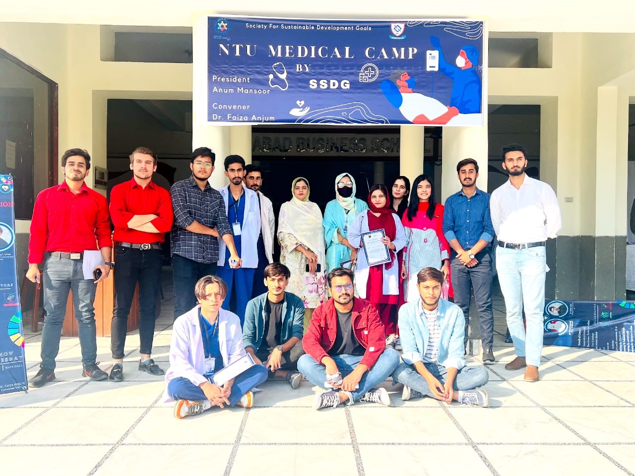 Take care of your body, it's the only thing you must live with. Society for Sustainable Development Goals NTU FSD in collaboration with Youth Serving Foundation (YSF) and NOVATEK PAKISTAN organized an awareness camp on Good Health and Wellbeing (SDG-3). The other collaborators were wings society, NCS and NTU OSH&E. The awareness was about Physiotherapy Screening and Prevention generally based on mental and physical health. The camp started with an inauguration ceremony and a briefing session for the students about the importance of good health and wellbeing. A division of five booths was done to offer the students a proper way to analyze themselves. Different Screenings tests were performed by the students followed by a consultation from the doctors present in the specific booth. The camp ended by souvenirs, awarded to the guests by the society and a group photo.