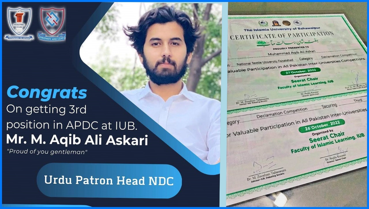 Congratulations! With the sense of pride and pleasure, NTU Debating Club’s urdu patron head, Mr. Aqib Ali Askari represents NTU in APDC, (National level) All Pakistan Declamation Contest organized by The Islamia University of Bahawalpur (IUB), Pakistan. He got 3rd Position among All Universities of Pakistan.