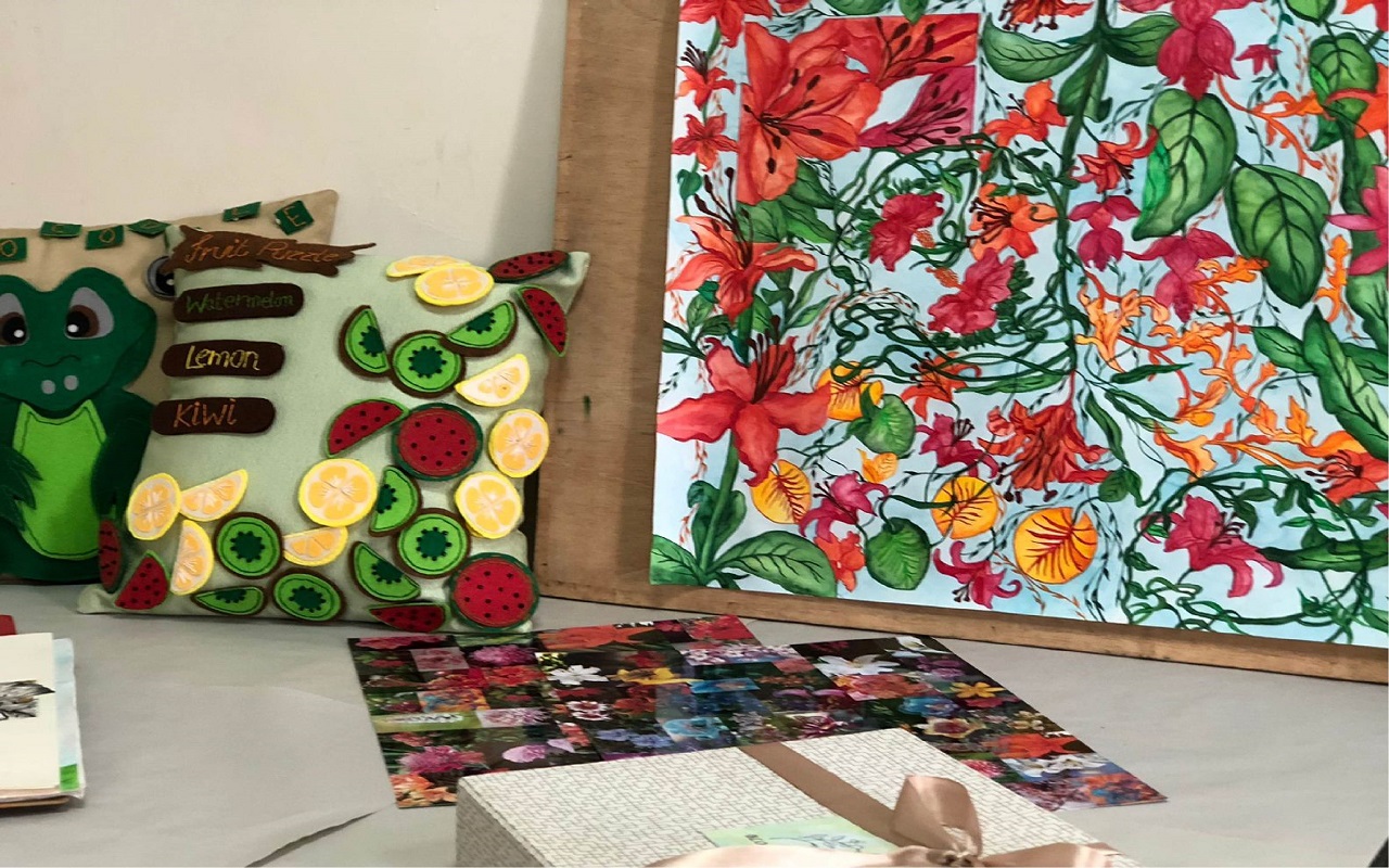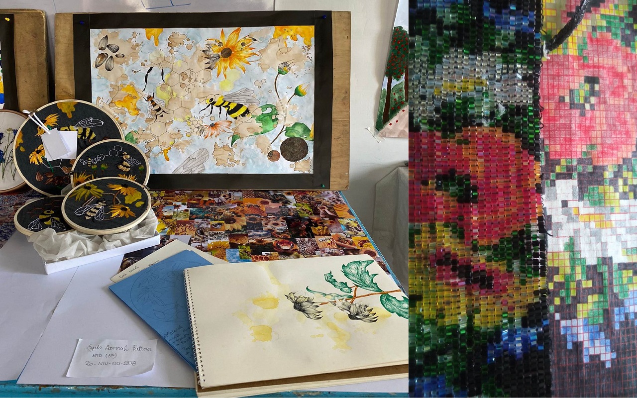 Exhibition witnessed the hard work and skill of design students. Variety of the projects including lampshades, cushions, Textile jewelry, jackets, pants, wall arts were beautifully displayed. The faculty and students of the University of Agriculture Faisalabad also visited the venue and appreciated the talented learners. The stall of jewelry using the technique of bead weaving was much praised by the visitors.