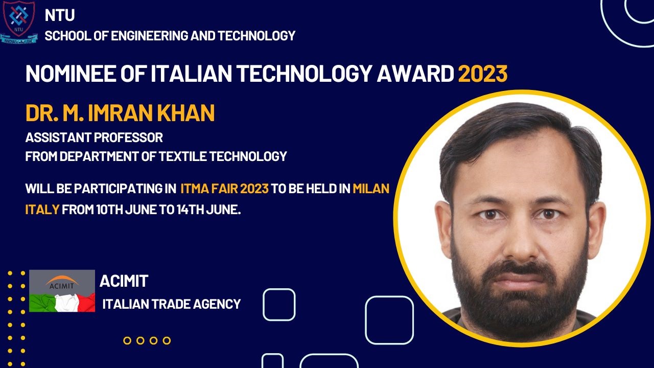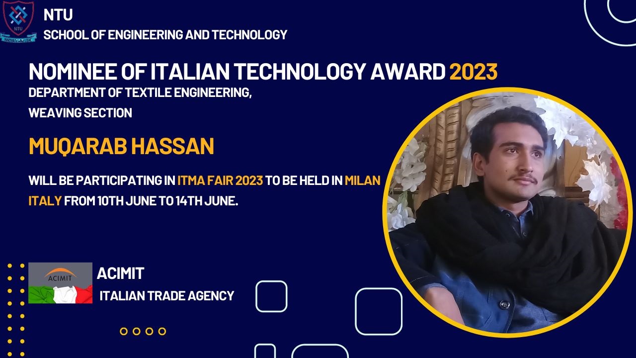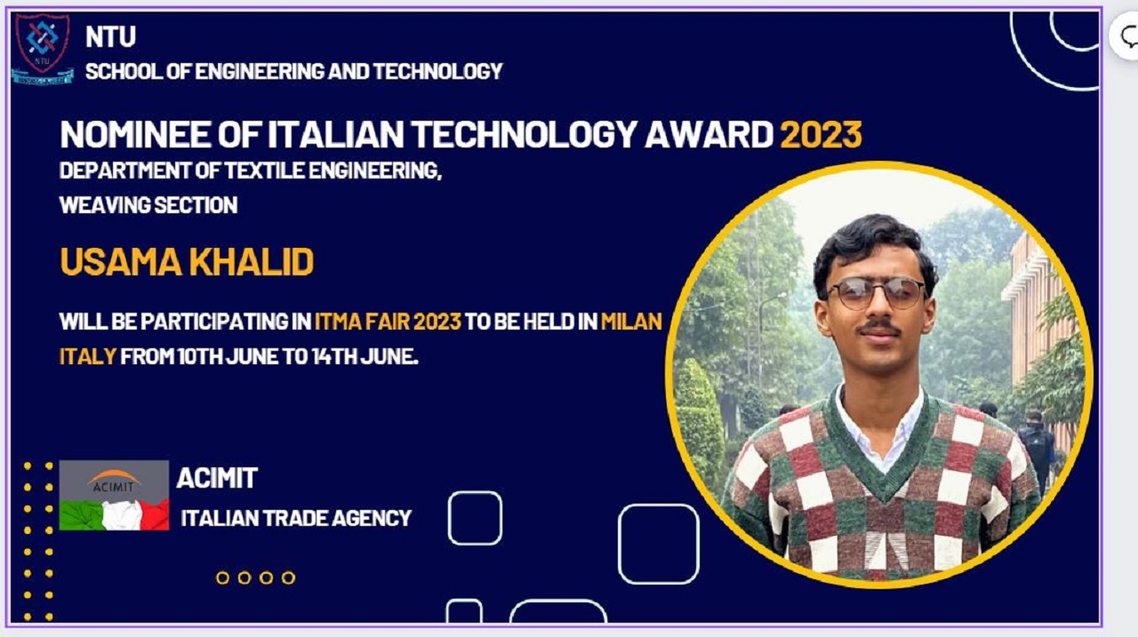 Congratulations to the Nominees of the Italian Technology Award from the Weaving Section, Department of Textile Engineering, NTU. The Italian Technology Award 2023 was organized by Italian Textile Machinery Manufacturers Association (ACIMIT) in collaboration with Italian Trade Agency (ITA) in Milan, Italy on 10-14 June 2023. The Italian Trade Agency honored Mr. Usama Khalid (enrolled in BS Textile Engineering), Mr.Muqarab Hassan Buttar (enrolled in BS Textile Engineering), and Dr. Imran Khan (Assistant Professor) with the Italian Technology Award on 14 April 2023. These students from Weaving Section, NTU will be visiting ITMA fair 2023 to be held in Milan Italy from 10 June to 14 June. This Fair consists of an exhibition of Textile machinery manufacturers from around the world and a Panel discussion by Textile Experts. This program is comprised of lectures, presentations, group discussions, and visits to various textile machinery manufacturing companies. It provided an incredible opportunity to collaborate with international academic institutions and learn about innovations in textile machinery. #ITMA #NTU #Milan #Italy.
