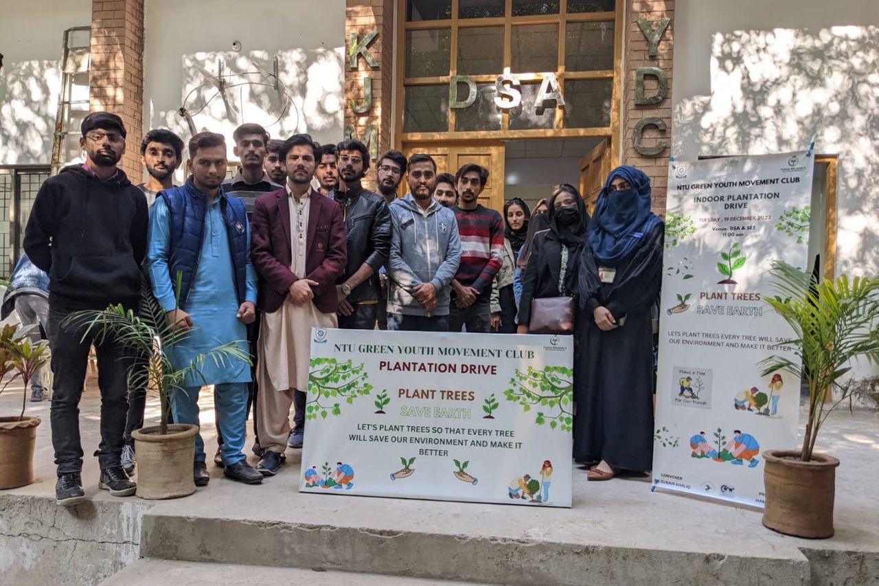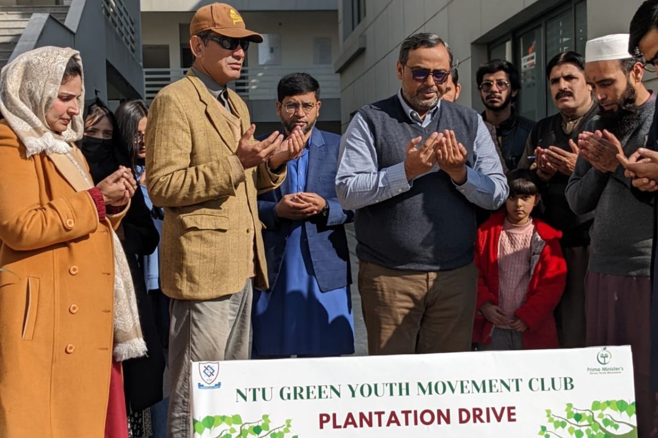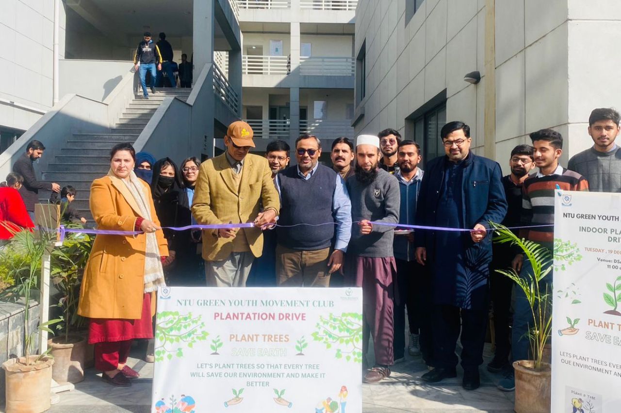 The NTU Green Youth Movement Club took a significant step towards environmental sustainability by organizing an Indoor Plantation Drive. The inauguration featured a symbolic ribbon-cutting ceremony led by the Muhammad Ayub Asghar Assistant Professor and Dean School of Engineering and Technology, Dr. Yasir Nawab, signifying a crucial moment in NTU's dedication to an eco-friendlier future. The event drew active participation from key figures in NTU's academic leadership, including Dr. Khubab Shaker, Chairman of the Department of Materials, Dr. Danish Mehmood, Advisor Students, Dr Muzammil Hussain Assistant Professor, Ms Nadia Shamim, Assistant Director Student Affairs, and Dr. Zubair Khaliq, Convener of the NTU Green Youth Movement Club.