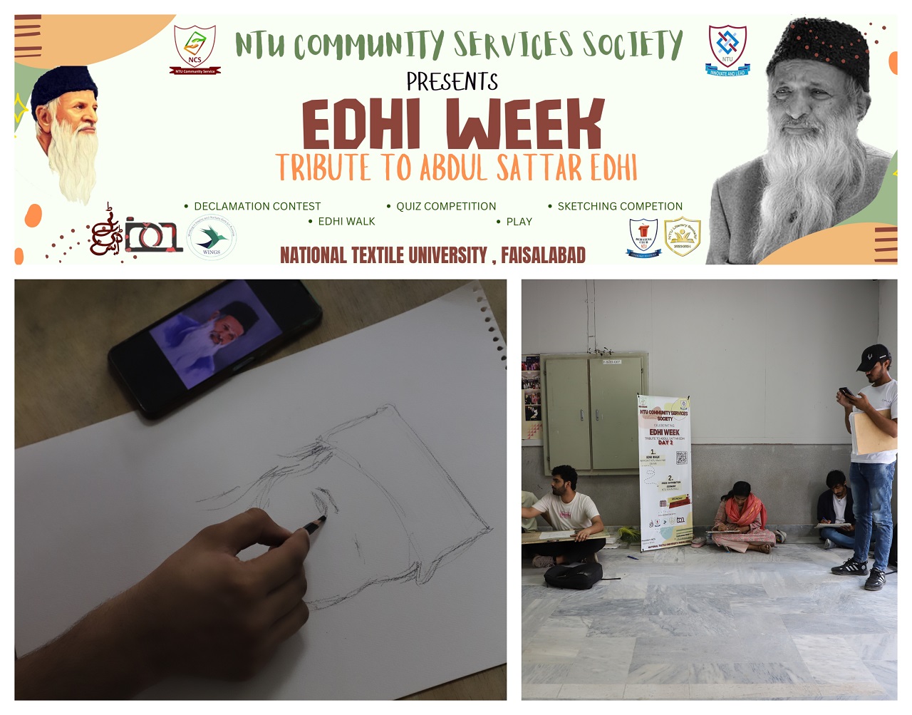 NTU Community Services Society under HEC-YDC organized the Edhi Week celebration with the NTU Debating Club, Textile Design, Literary and Wings Society from May 19 to May 21, 2024.