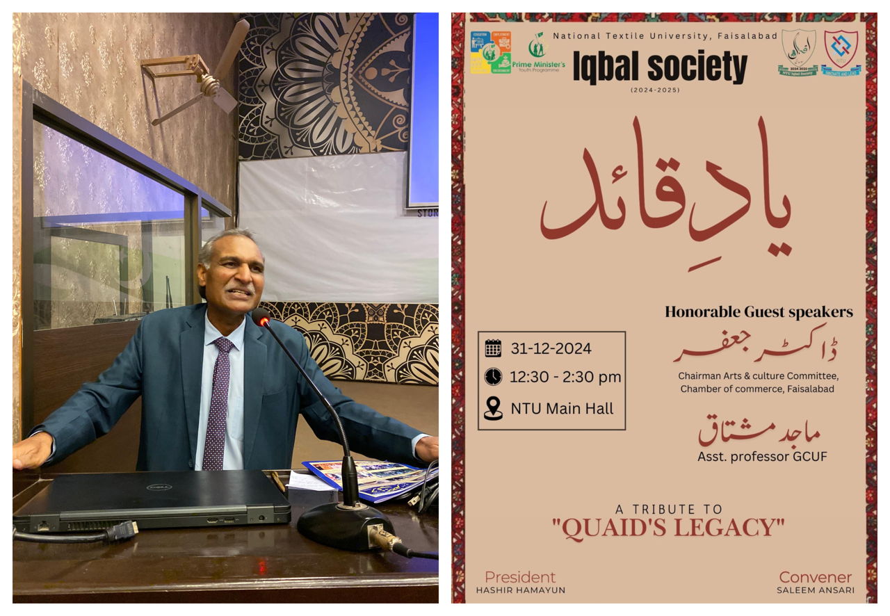 The NTU-YDC Iqbal Society organized a thought-provoking event, "Yaad-e-Quaid," to honour the enduring vision and principles of Quaid-e-Azam Muhammad Ali Jinnah. Held on Tuesday, December 31, 2024, the event brought together an enthusiastic audience and distinguished speakers, including Dr. Jaffer Siddique Writer, Poet and Convener of the Arts & Culture Society of FCCI and Dr. Majid Mushtaq Asst. Professor GCU (Urdu Department), shared their insights on Quaid's legacy.