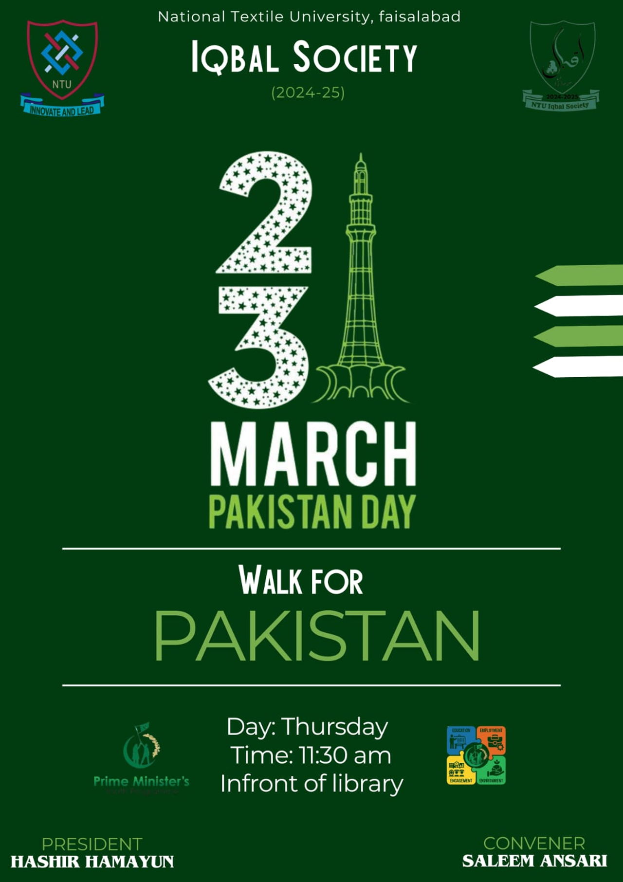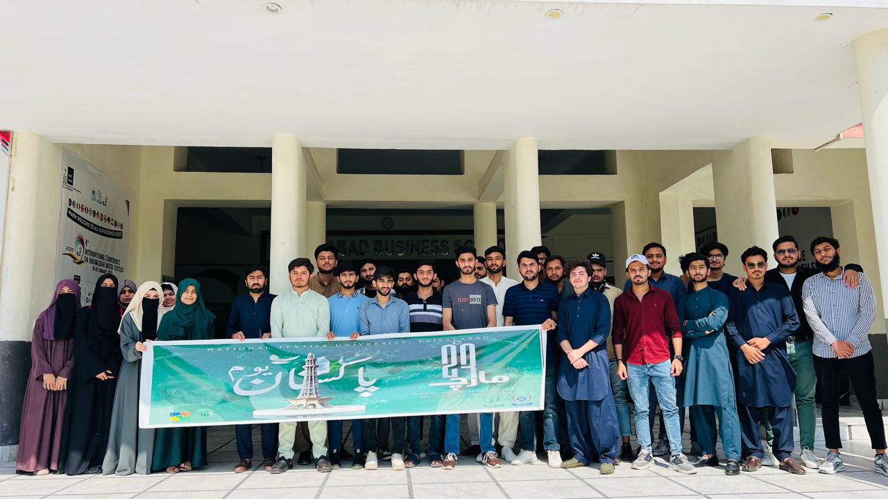 Faisalabad, March 23 – Students of the Iqbal Society, NTU YDC organized a walk at National Textile University to commemorate Pakistan Resolution Day. Participants carried national flags and banners, reaffirming their commitment to Pakistan’s progress.