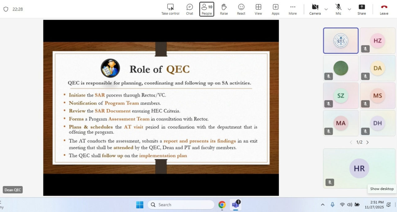 Quality Enhancement Cell of National Textile University (NTU) organized a training workshop on “Preparation of Self-Assessment Report (SAR)” on November 27, 2025, for Program Team members of NTU Main and Karachi Campus. The resource person was Mr. Muhammad Haroon, Asst. Director QEC. Mr. Haroon gave a comprehensive presentation on the importance and preparation mechanism of SAR in the light of SAR on PREE Manual of HEC. At the end of the training all questions were answered related to the assessment report.
