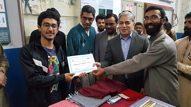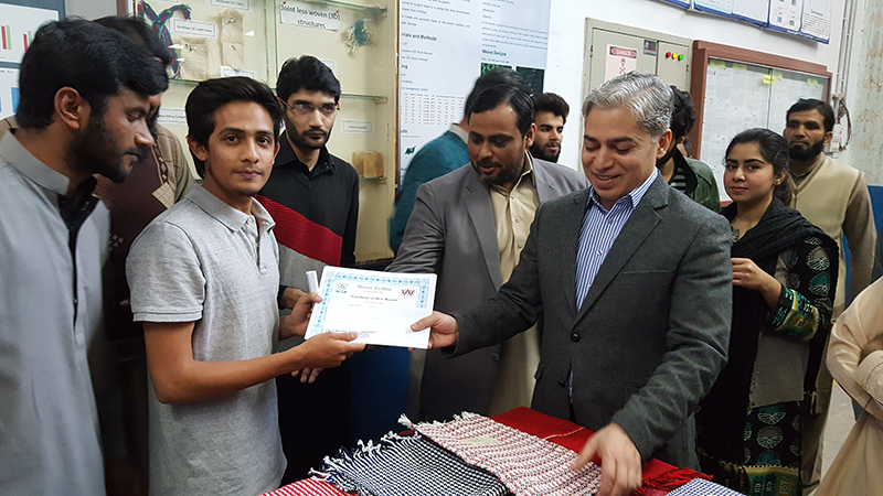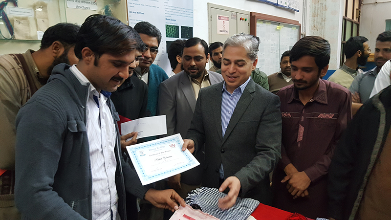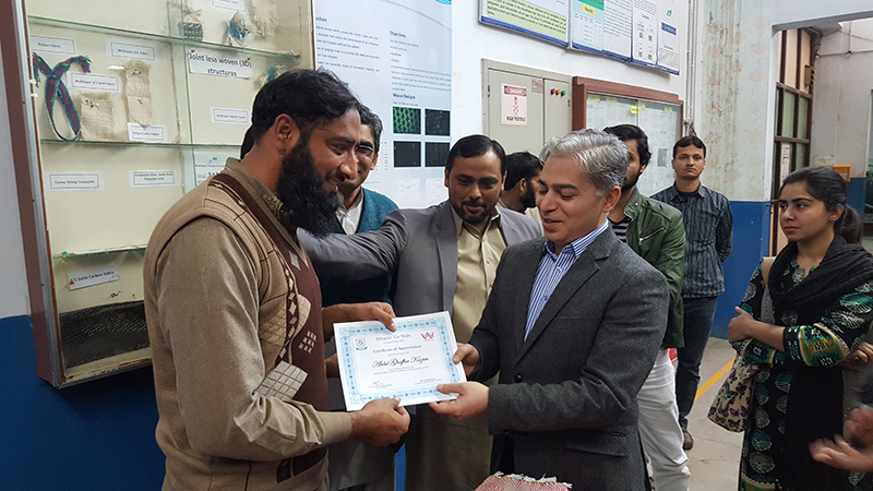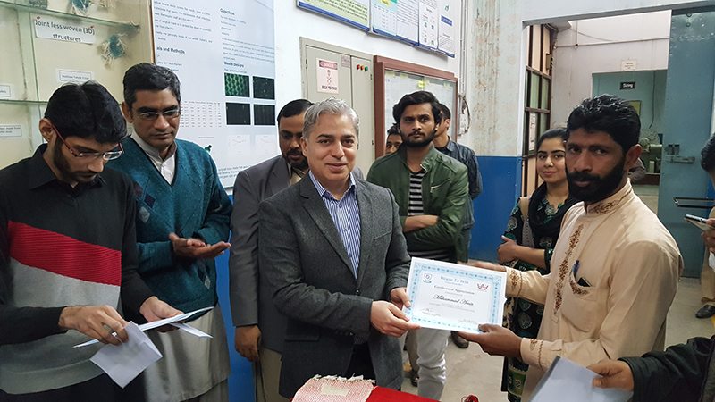 Cash Prizes and certificates were distributed among students by the worthy rector NTU, Prof. Dr. Tanveer Hussain. He appreciated the efforts of students and their abilities to produce the fabrics, translating the theory into practical application. He further encouraged the students to participate in such academic activities dynamically. Dr. Yasir Nawab, chairman weaving department also appreciated the students and lab staff for providing the helping hand to the students for the said competition.